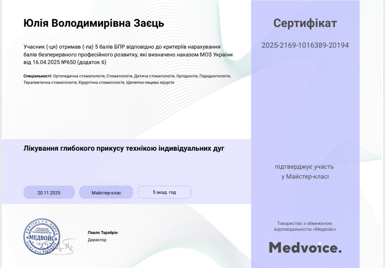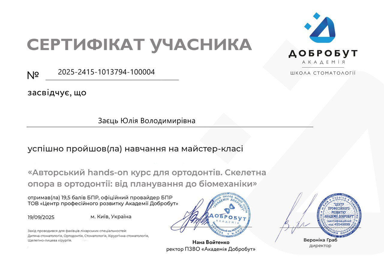 "Принцип моей работы: «Функция и эстетика в идеальном балансе, только индивидуальные решения». История о себе: с детства была причастна к стоматологии, поэтому решила, учиться, увлеклась ортодонтией. За что люблю свою работу: динамика в работе, интересные случаи, отсутствие рутины."